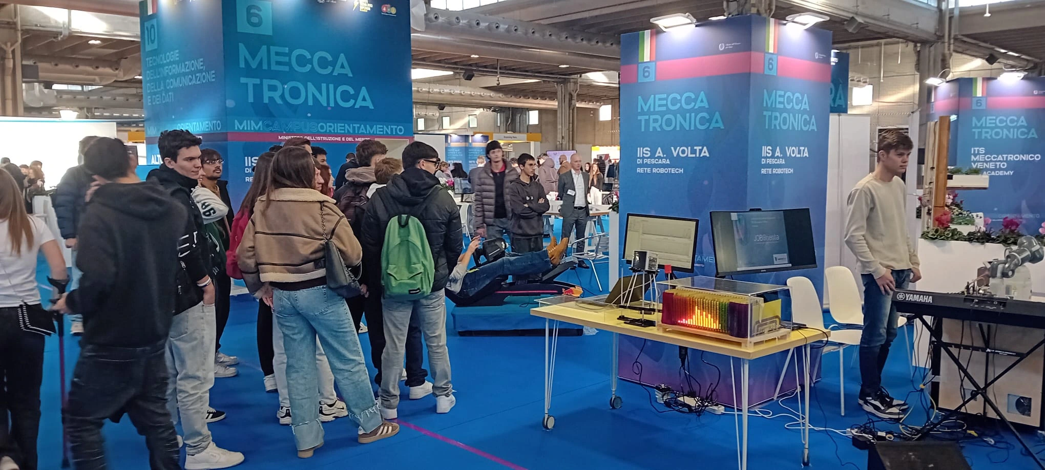 I nostri studenti Gaia Scipione – 5EI, Elisa Peca – 5EI, Leonardo D’Onofrio – 4AI, Alessandro Sposo – 4AI, Sebastian Console- 4AE, Cristian Torrese- 5AE, Matteo Bruni- 4TR, Kevin Vacante – 4TR, coordinati dai professori Fabio Di Matteo, Danilo Micalone e Fabio Tatasciore presidiano tutte le postazioni, spiegano le tecnologie, accompagnano i visitatori nelle prove pratiche e raccontano le opportunità dei diversi percorsi di studio.